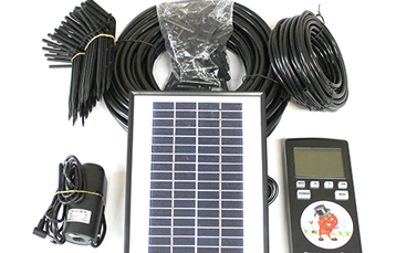 Комплектация системы прикорневого капельного полива с автоматикой практически такая же, как и у системы без автоматики за исключением наличия солнечной батареи (1 шт.), контроллера (1 шт.) и насоса (1 шт.).