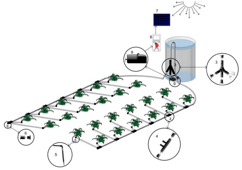 Комплектация системы прикорневого капельного полива с автоматикой практически такая же, как и у системы без автоматики за исключением наличия солнечной батареи (1 шт.), контроллера (1 шт.) и насоса (1 шт.).